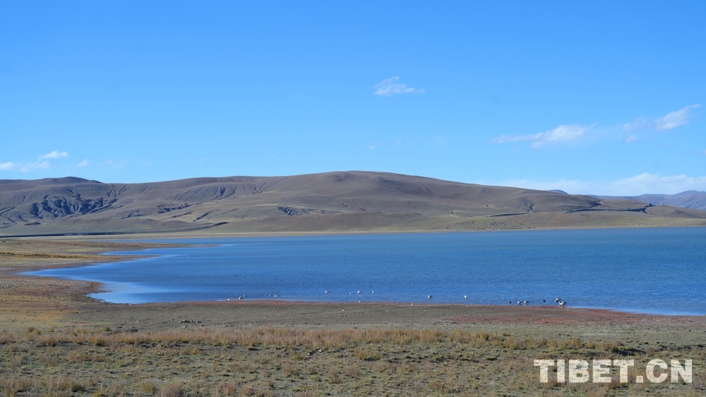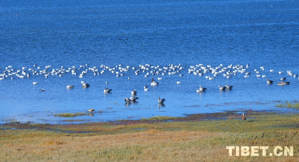 圖為鳥類成群在哲古湖畔棲息 攝影:次旦拉姆
